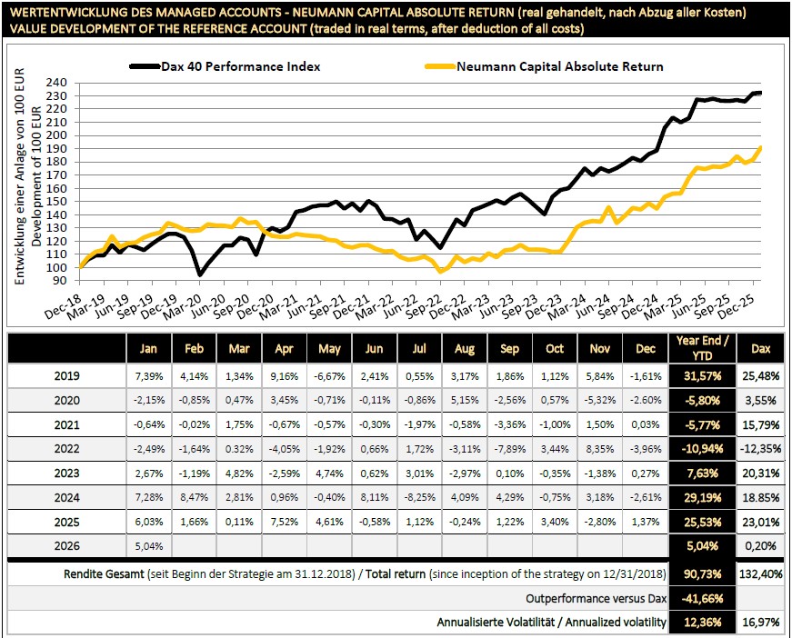 Unsere real gehandelte Portfoliostrategie „NEUMANN CAPITAL ABSOLUTE RETURN" (Managed Account auf eigene Rechnung) hat mehrere Alleinstellungsmerkmale.