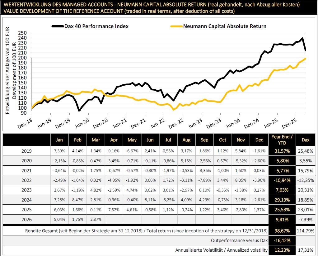Our proprietary developed and real traded equity-oriented portfolio strategy „NEUMANN CAPITAL ABSOLUTE RETURN" has several unique features.