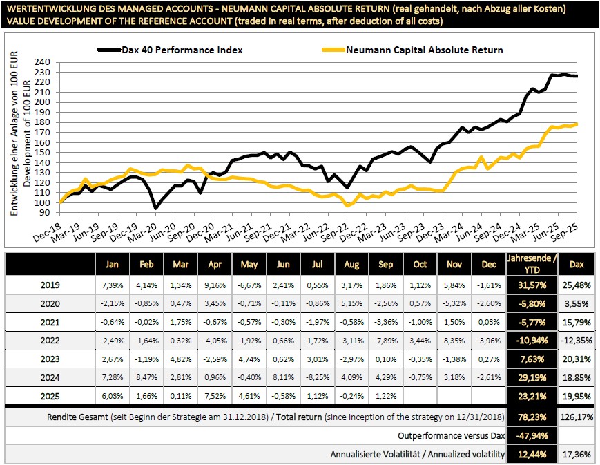 Our proprietary developed and real traded equity-oriented portfolio strategy NEUMANN CAPITAL ABSOLUTE RETURN" has several unique features.