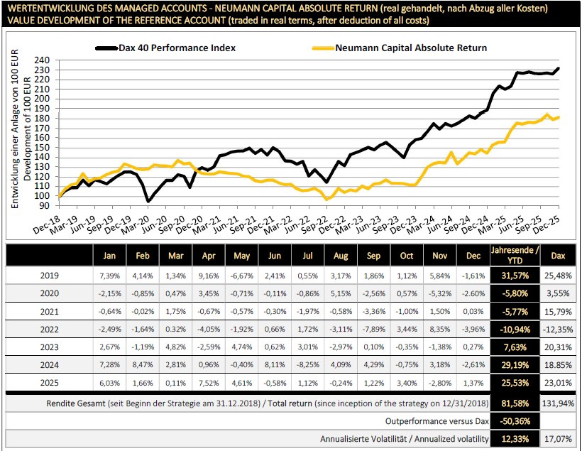 Our proprietary developed and real traded equity-oriented portfolio strategy „NEUMANN CAPITAL ABSOLUTE RETURN" has several unique features.